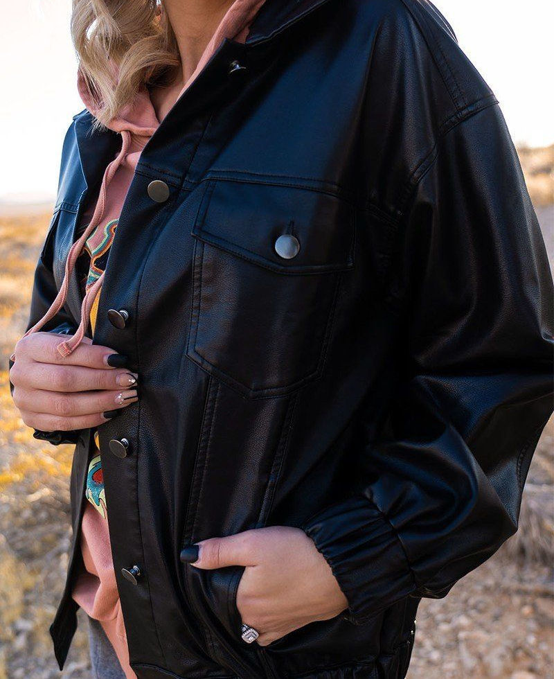 Make a statement with the "Urban Edge" Faux Leather Jacket in Black. Add it to your cart now and experience the perfect blend of comfort and urban style!