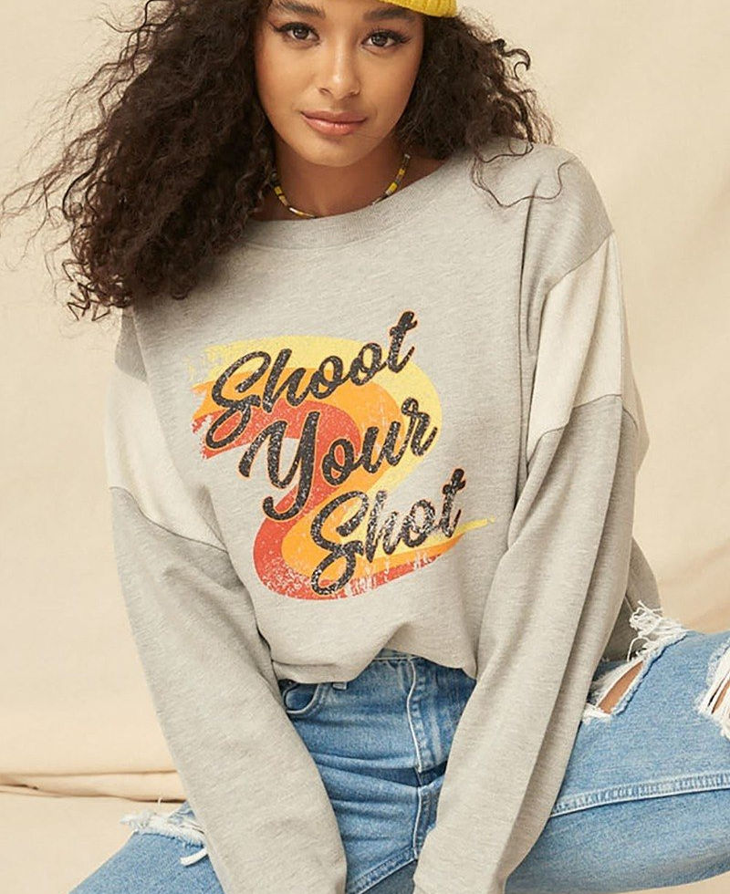 • Vintage Vibes: Our French Terry Knit Graphic Sweatshirt brings a touch of nostalgia with the Shoot Your Shot text graphic print, perfect for a stylish and laid-back look.