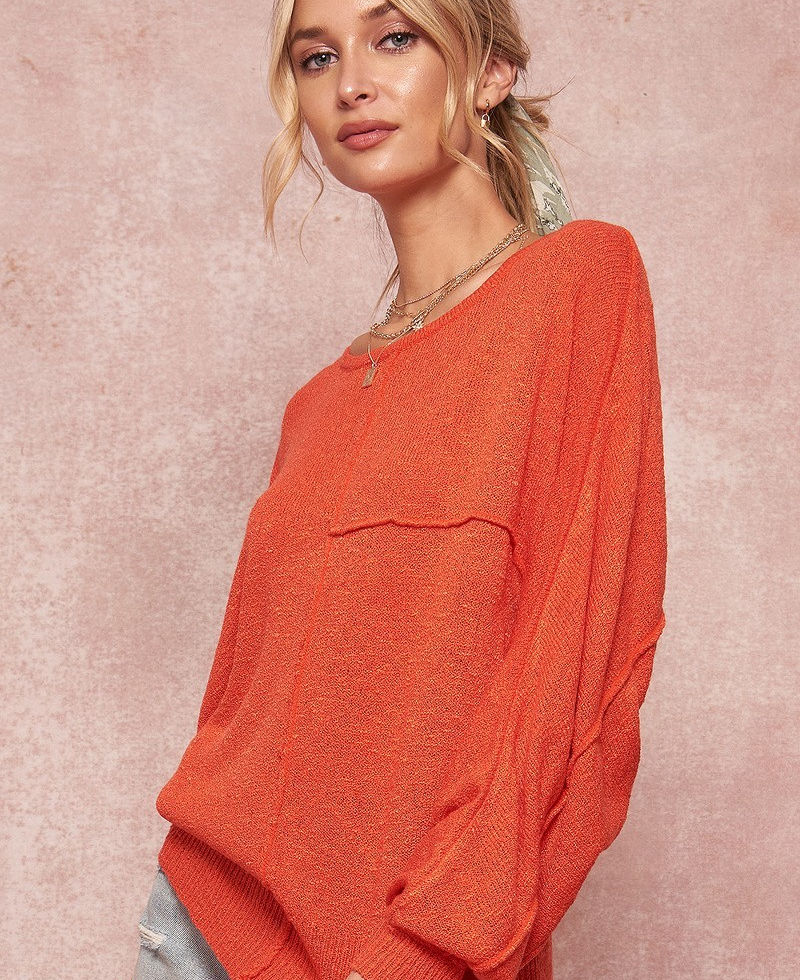 3. Design: Features a round neckline, long dolman sleeves, exposed seam detailing, ribbed neckline, cuffs, and hem, providing a chic and trendy look.