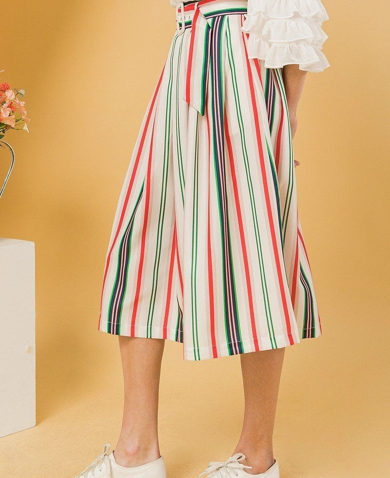 This skirt effortlessly combines style and practicality with its multicolored stripe print, pleated construction, and functional details, making it a standout choice for various occasions.