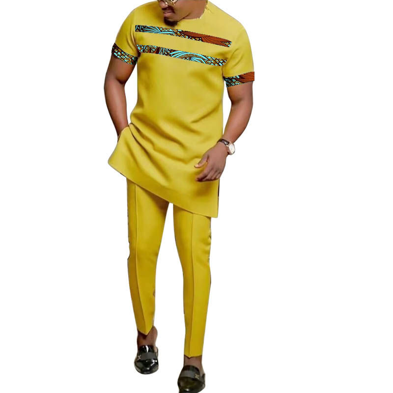 African Fashion Yellow Men's Set Outfits Short Sleeve Tops Patch Trousers