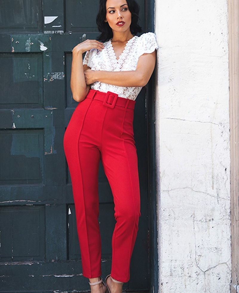 3. "Red is a bold and eye-catching color, and these pants are my new go-to! The self-fabric buckle belt adds a stylish touch, and the fit is flattering. I feel confident and elegant in them!" - Emily L.