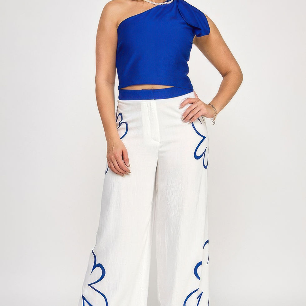Striking and stylish, this bow one-shoulder top and print pants set delivers a bold, coordinated look with effortless flair. The top features a dramatic bow detail at the shoulder, adding volume and a playful touch to the asymmetrical silhouette. Paired with eye-catching printed pants, the set balances structure and movement for a refined yet relaxed fit. Crafted from a lightweight rayon-blend fabric, it offers breathable comfort and a soft, fluid drape. Perfect for vacations, summer events, or statement daytime wear, this two-piece ensemble brings instant polish with minimal effort.