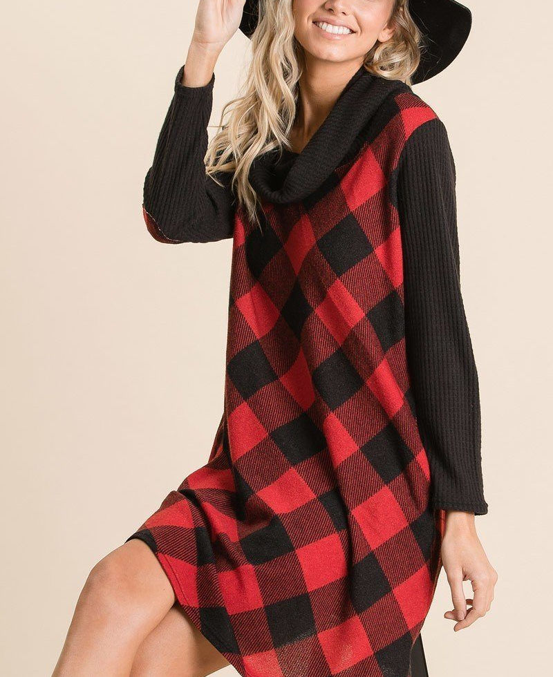 Introducing our "Classic Charm" Buffalo Plaid Tartan Swing Dress, proudly made in the U.S.A. This dress combines timeless style with modern comfort, featuring a classic buffalo plaid tartan pattern, a soft waffle brush cowl neck and sleeves detail, side pockets, and charming elbow patches.