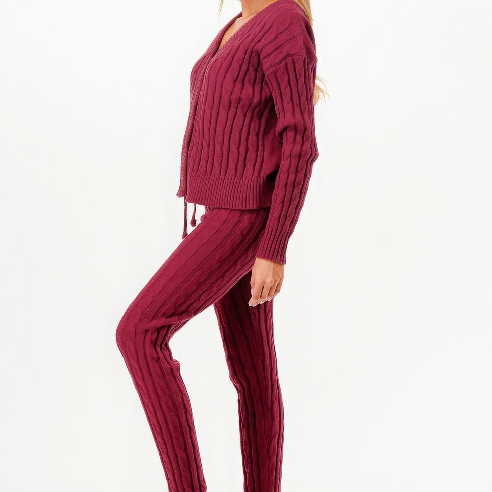 Add timeless elegance to your wardrobe with our Cable Sweater Cardigan 2-Piece Set in wine. Shop now and enjoy comfort and style in every wear!