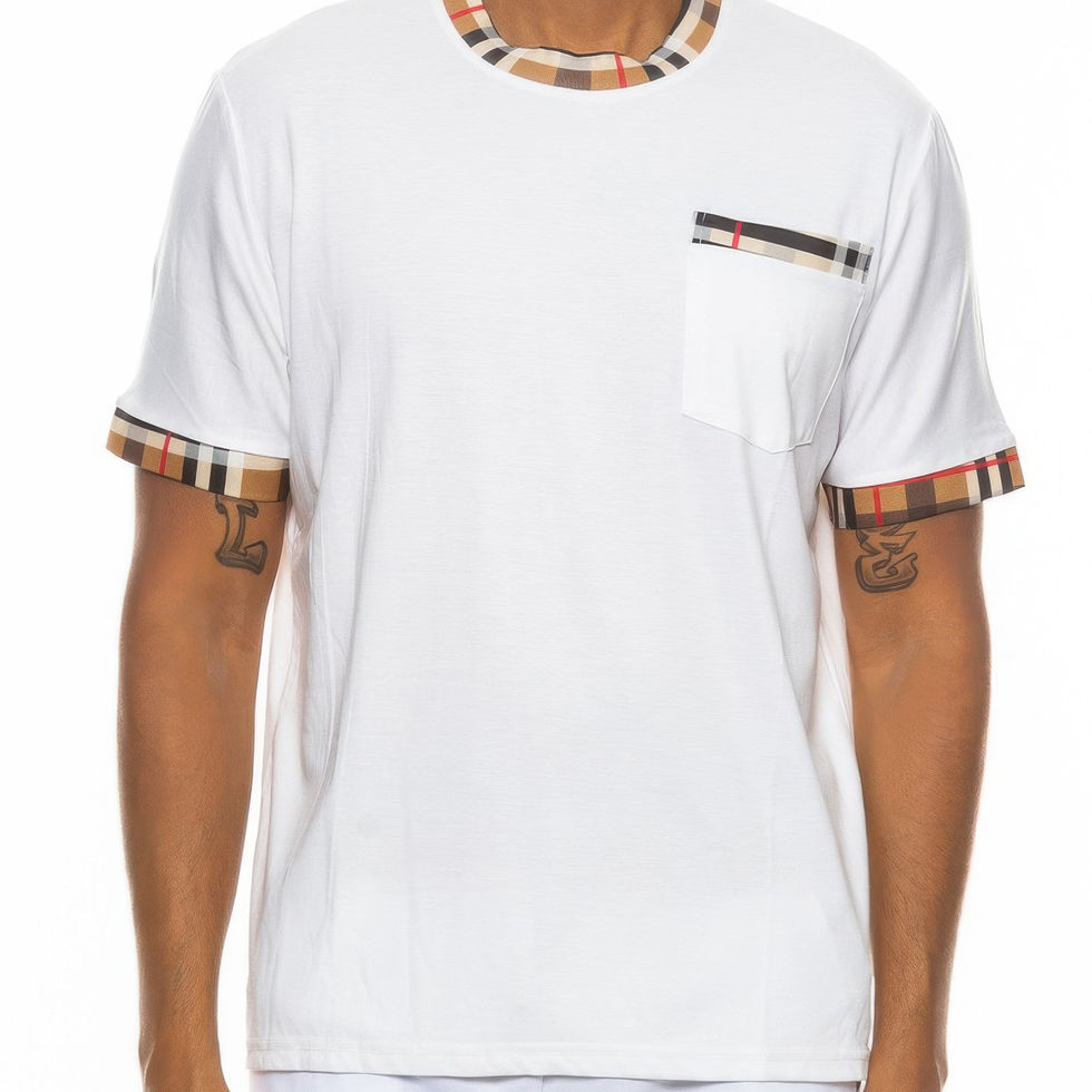 Add a touch of classic style to your casual wardrobe with our Checkered Short Sleeve Tee. Designed for comfort and versatility, this tee features a stylish checkered print on the collar, cuffs, and chest pocket for a distinctive and modern look.