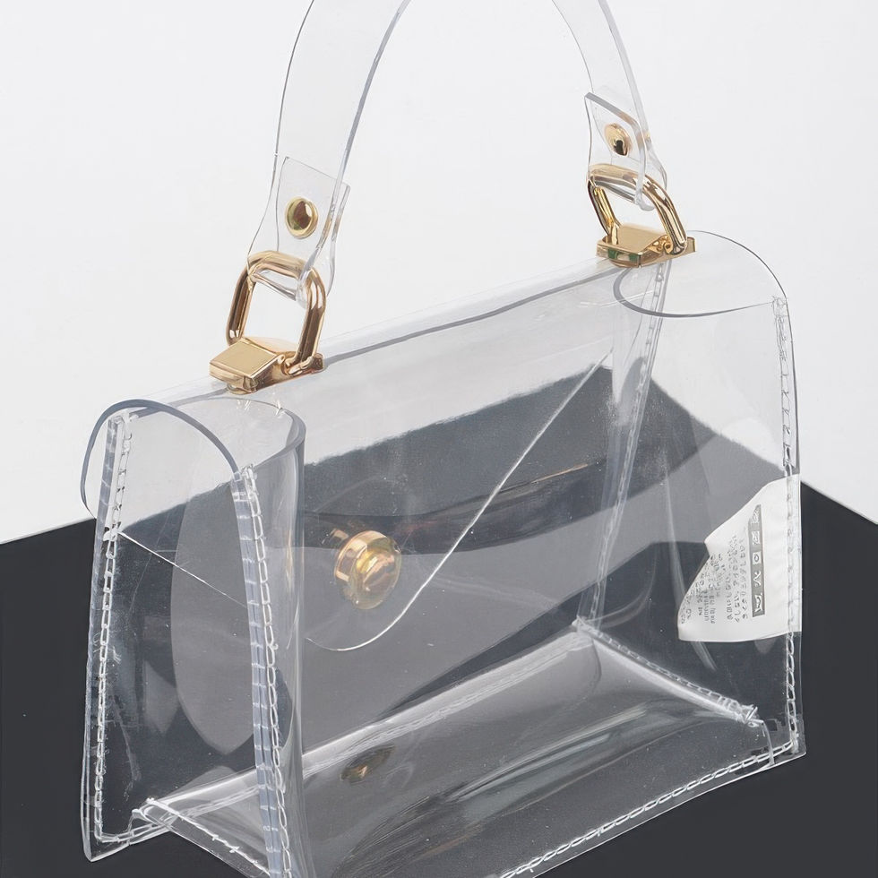 Add a modern and sleek touch to your accessory collection with our Clear PVC Top Handle Crossbody Bag. Designed for those who appreciate both style and functionality, this bag combines transparency with elegant metallic accents, making it a must-have for any fashion-forward individual.