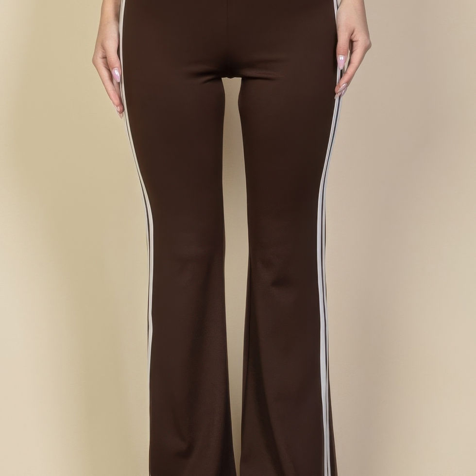 Refresh your casual style with our Contrast Side Stripe Flare Pants, designed to offer a sleek, modern fit with added flair. Crafted from a soft, sleek, and medium-weight stretch novelty premium knit, these pants provide the perfect balance of comfort and style, with just the right amount of stretch to flatter your shape.