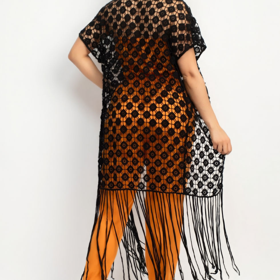 Elevate your style with our Crocheted Open-Front Fringe Kimono in classic black. Shop now in sizes S/M and M/L and embrace bohemian chic effortlessly!