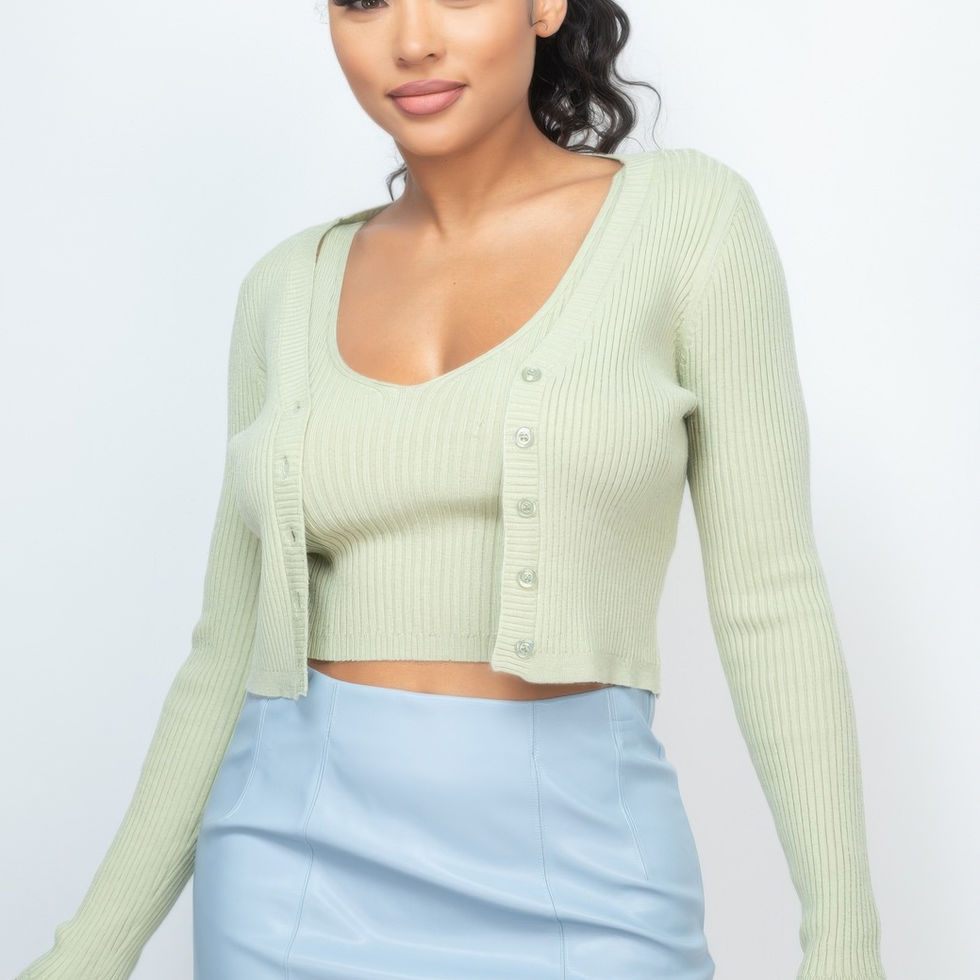 Effortlessly combine comfort and style with this ribbed knit crop tank and cardigan sweater set. The scoop neck tank features a flattering, body-skimming fit that's perfect for layering or wearing solo. Paired with a coordinating button-front cardigan, this two-piece look delivers a cozy yet polished vibe. The ribbed texture adds dimension, while the soft stretch blend keeps things comfy from day to night. Wear them together for a chic, put-together outfit or mix and match for endless styling options.