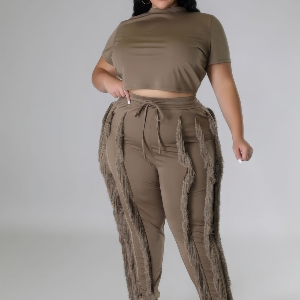 Elevate your wardrobe with our Crop Top Two-Piece Set in Mocha, a sophisticated ensemble that effortlessly combines style and comfort. Crafted from a blend of 95% polyester and 5% spandex, this set offers a luxurious feel and flexibility for all-day wear.