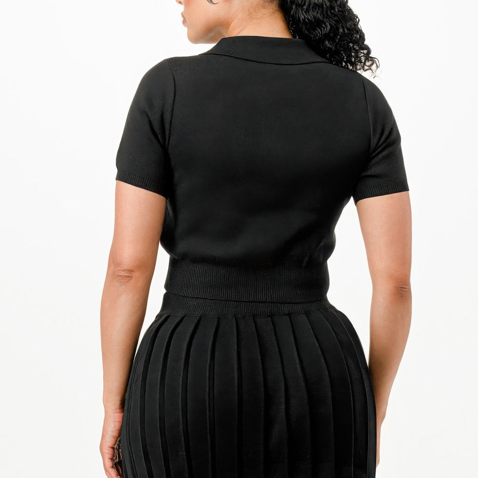• Two-piece set includes cropped polo sweater shirt and matching skirt