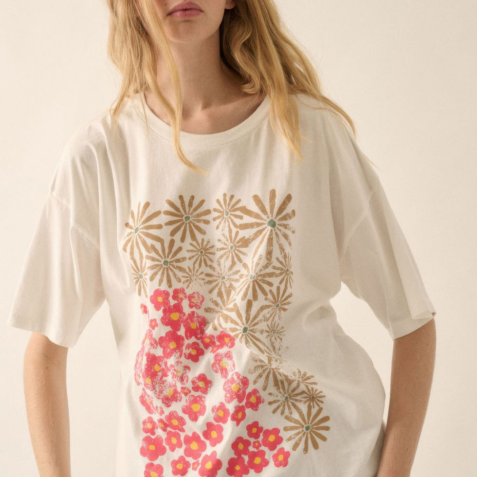 Add a vintage-inspired touch to your wardrobe with our Duo Flowers Vintage-Wash Oversized Graphic Tee in Ivory. Order now and enjoy the perfect blend of comfort, style, and timeless appeal!