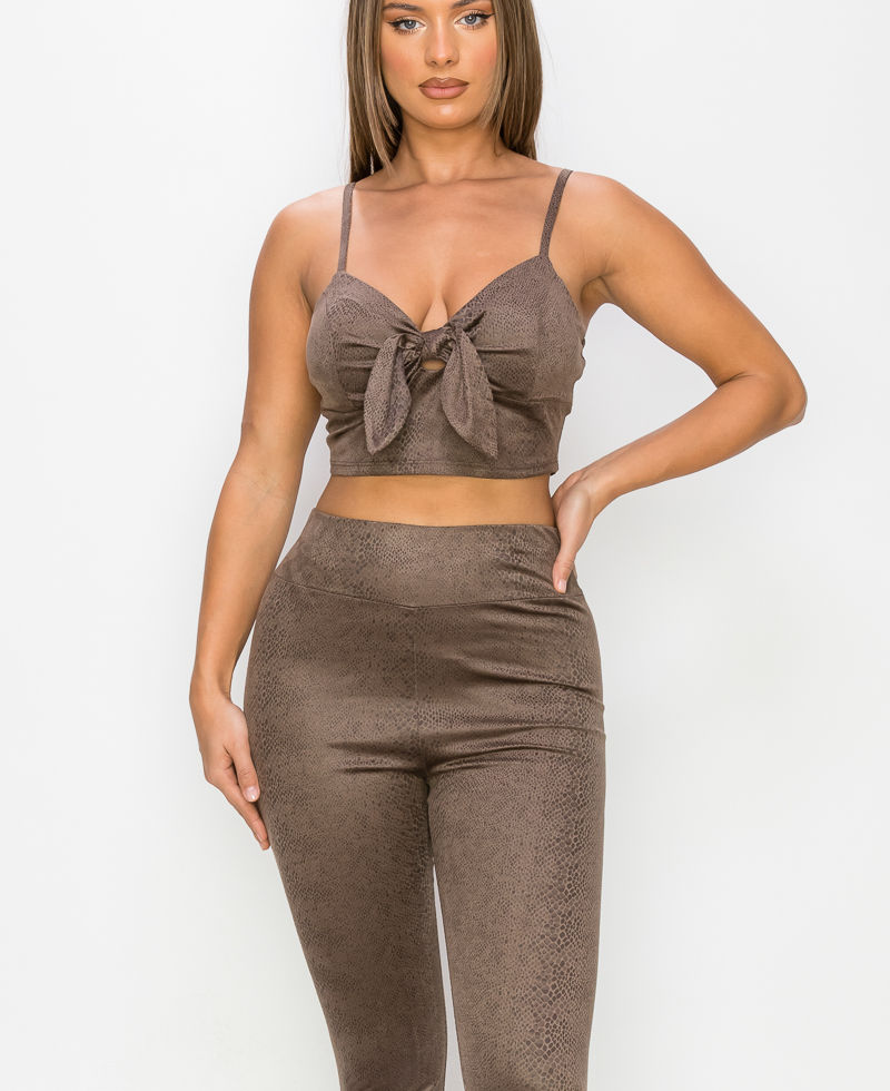 Add our Embossed Snake Print Top and Leggings Set in Mocha to your cart now and embrace the perfect blend of fashion and comfort!
