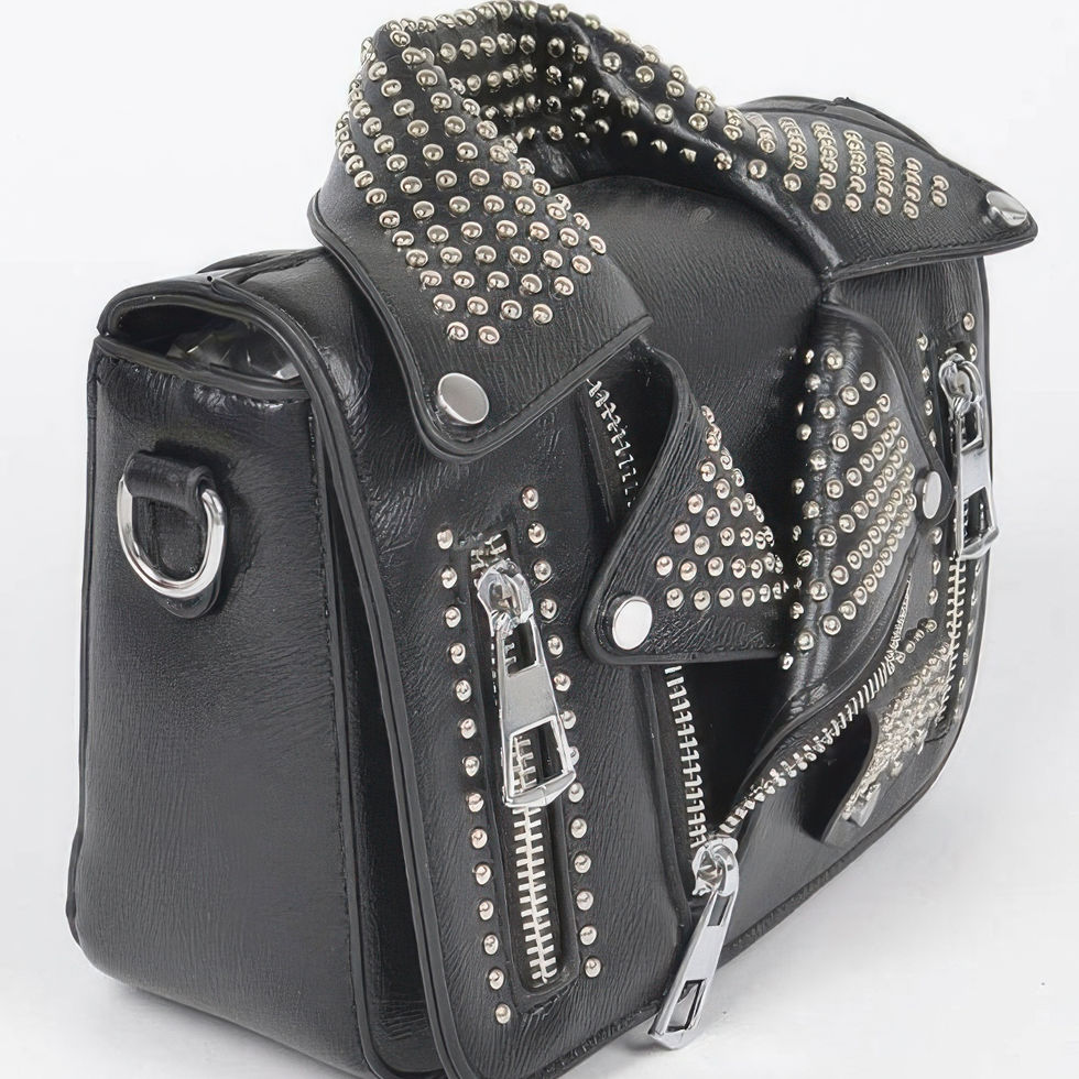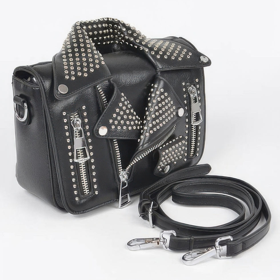Channel edgy glamour with the Faux Leather Metal Studded Jacket Clutch. Inspired by statement outerwear, this clutch features bold studded detailing on smooth faux leather. Compact and stylish, it’s the perfect piece to add a rock-chic twist to any look.