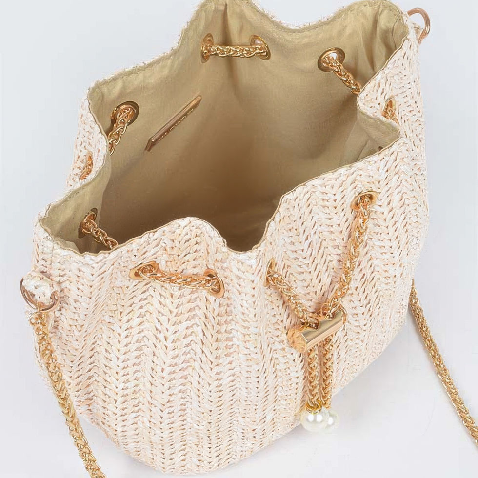 Effortlessly stylish, the Faux Straw Bucket Crossbody Bag combines seasonal texture with everyday functionality. Designed in a compact bucket silhouette, this bag features a faux straw exterior crafted from durable polyurethane, offering the natural charm of straw with added resilience. The structured shape is complemented by gleaming gold-tone chain details that bring a modern edge to its breezy design. Lightweight and hands-free, it's perfect for warm-weather outings, from brunch dates to weekend getaways. Versatile and eye-catching, this crossbody adds a fresh twist to your accessory collection.