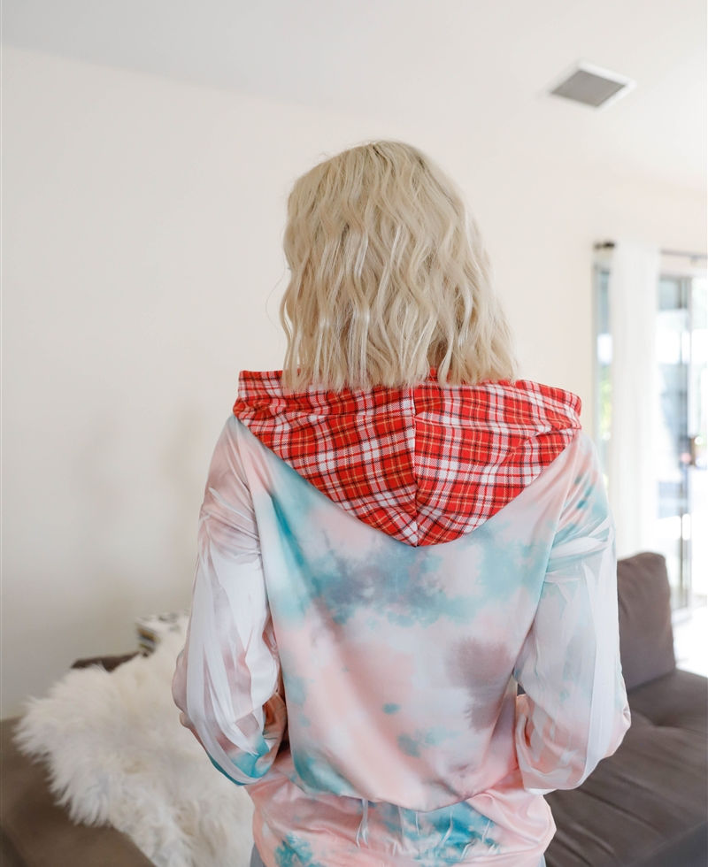 Why Choose Feather & Tie-dye Print Contrast Plaid Hood Sweater?