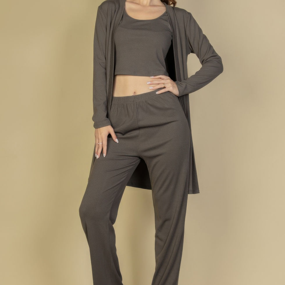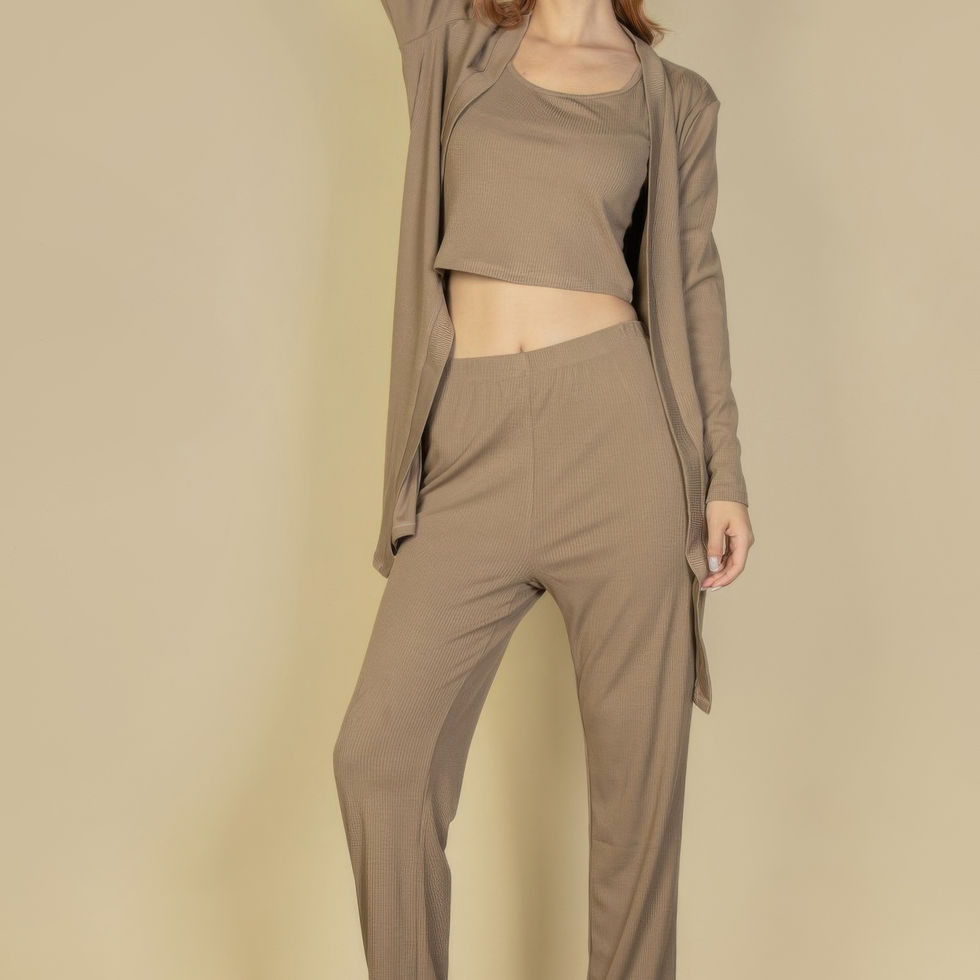 Flat Back Rib 3 Pieces Cami Top With Pants And Long Cardigan Set