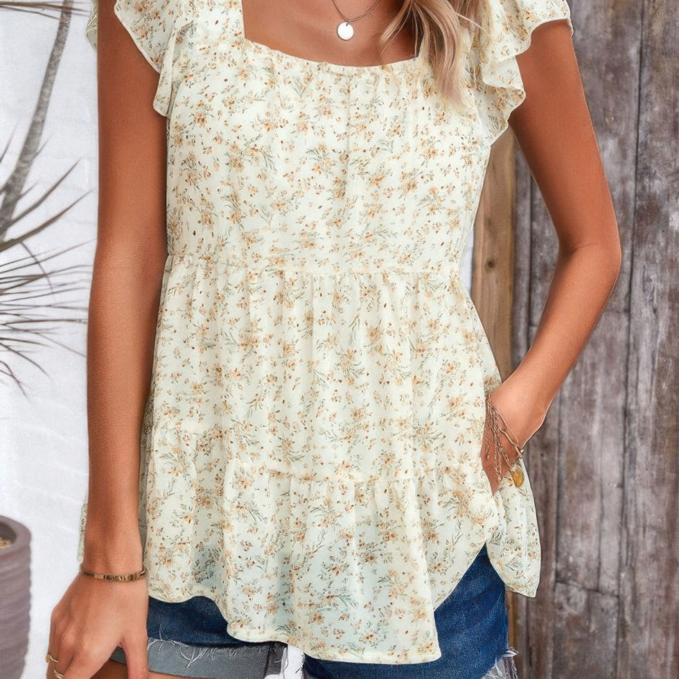 This floral print square neck ruffle sleeve tiered blouse is a playful yet sophisticated piece that brightens up your everyday look. Crafted from 100% polyester, it’s light, airy, and comfortable for warm weather and relaxed occasions. The square neckline frames your face beautifully, while the ruffle sleeves add a soft, feminine detail. The tiered design creates a breezy silhouette that’s both flattering and easy to wear. Ideal for pairing with jeans or skirts, this blouse brings a fresh, vibrant feel to casual outings, vacations, or any day you want to feel effortlessly stylish.