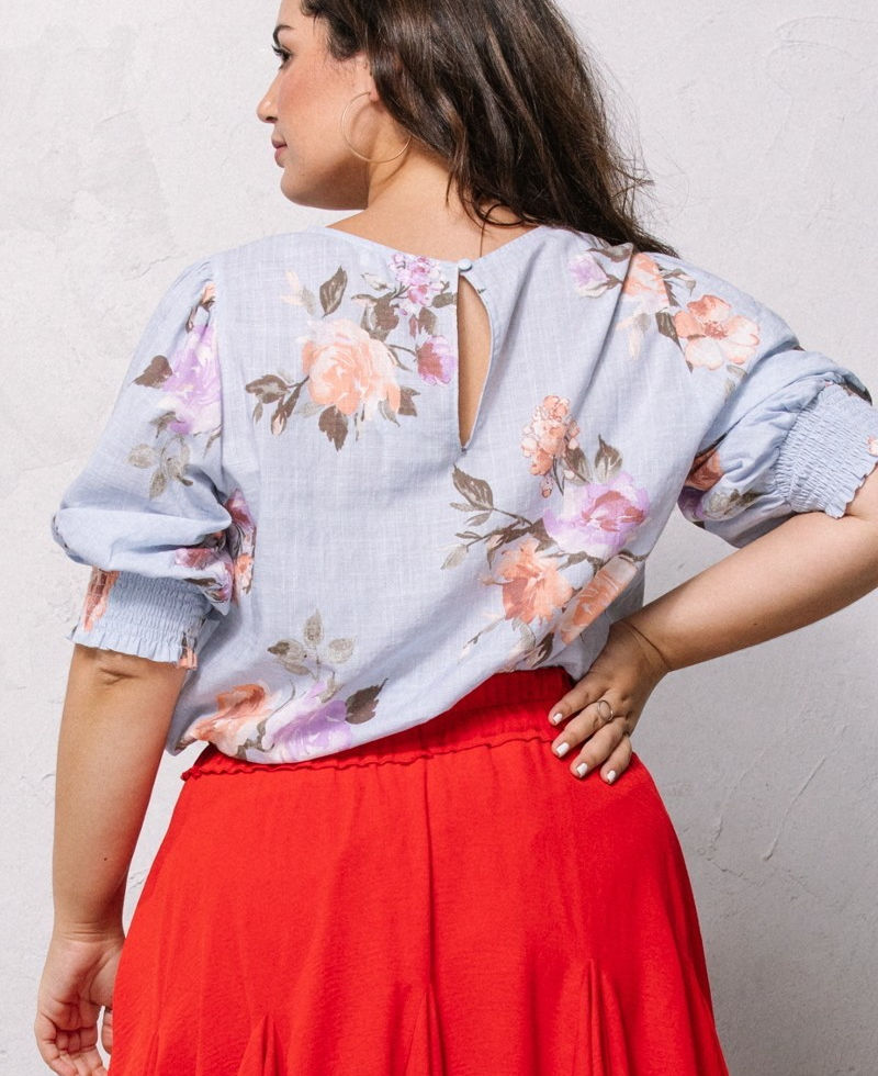 Elevate your style with our Floral Printed Woven Blouse in Spring Blue. Add it to your cart now and experience the perfect blend of fashion and comfort!