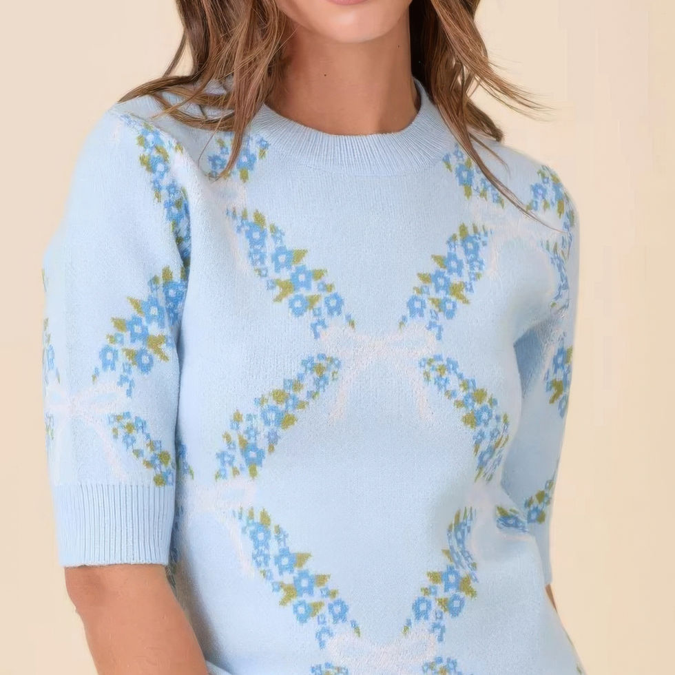 The Floral Ribbon Print Sweater Knit Top is a perfect blend of comfort and feminine charm. Crafted from 100% acrylic, this short sleeve top features a cozy sweater knit construction that offers softness and warmth. The floral ribbon print adds a delicate and whimsical touch, elevating the classic silhouette with a splash of color and pattern. Easy to style and versatile for any occasion, this top is a delightful addition to your wardrobe for casual outings or cozy gatherings.