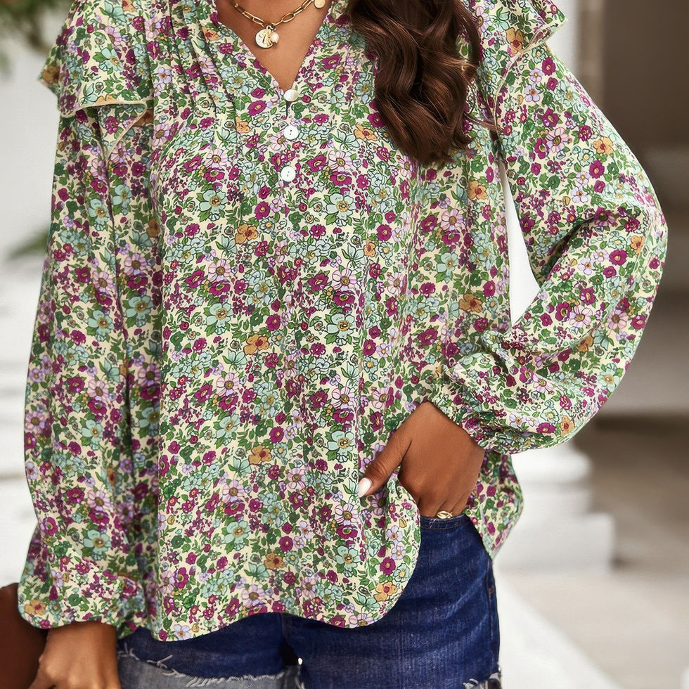 The Floral V Neck Button Ruffle Long Sleeve Top brings a fresh, romantic touch to your everyday wardrobe. Crafted from 100% polyester, this top features a delicate floral print that adds soft charm and a pop of color. The V neckline creates a flattering, feminine silhouette, while the button front and ruffle detailing provide a playful, refined finish. With long sleeves for added coverage, this top is perfect for cooler days and transitions effortlessly from casual outings to more polished occasions.