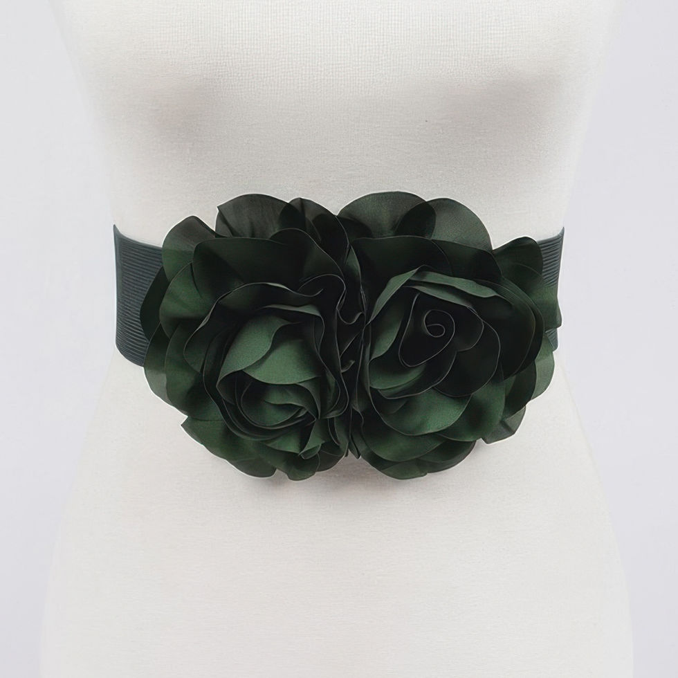 Make a bold and feminine statement with the BlossomBelt, a flower-inspired belt designed to celebrate natural beauty. Crafted from a blend of polyurethane and elastic, this belt combines structure with stretch for a comfortable, flattering fit. The standout feature is its pair of oversized floral appliqués, adding sculptural elegance and charm. With a width of 2.3 inches, it beautifully defines the waist, making it ideal for styling with dresses, skirts, or tailored looks. Whether worn casually or as a finishing touch for a special occasion, the BlossomBelt brings graceful detail to any outfit.