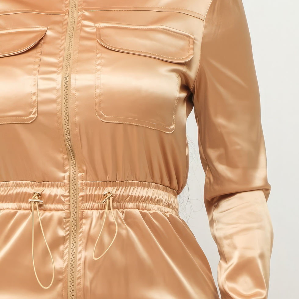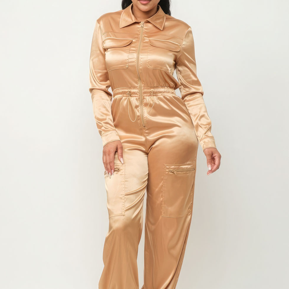 Elevate your glamour with our Gold Satin Solid Zipper Detail Jumpsuit, available in sizes S, M, and L. This chic ensemble features a collared long sleeve top with a front zipper and side pockets, paired with elastic waistband tie side zipper pockets detail jogger cargo pants for a modern and comfortable look.