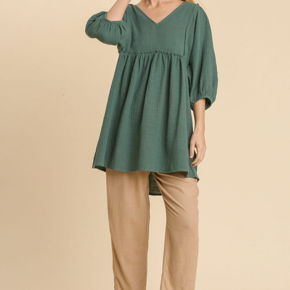 Add our Gauze Slub V-Neck Frayed Edge Detail Tunic Dress in Seaweed to your cart now and experience the perfect blend of fashion and comfort!