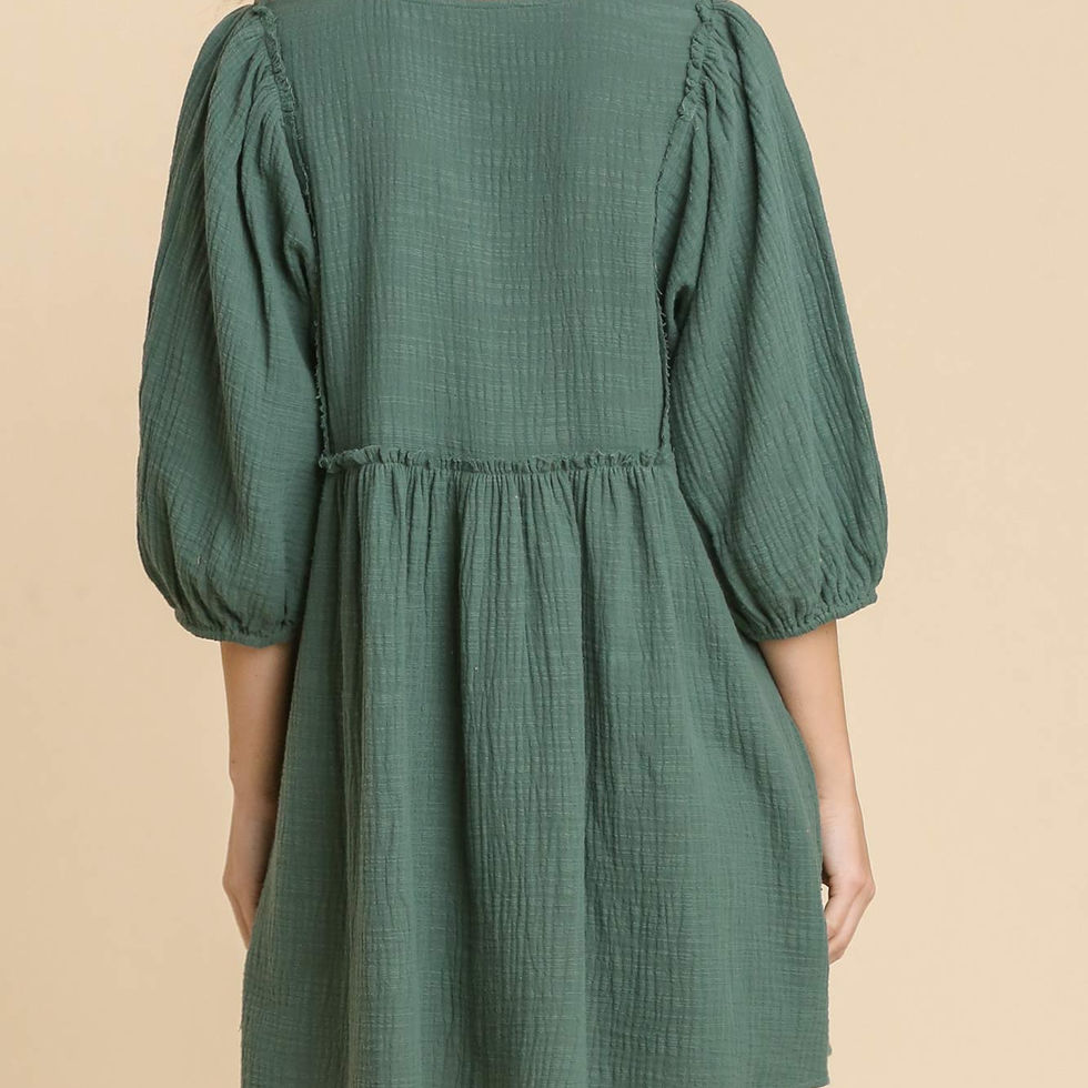 "The Seaweed color of this dress is so earthy and versatile! The gauze slub texture and frayed edge details give it a relaxed and bohemian charm." - Emily C.