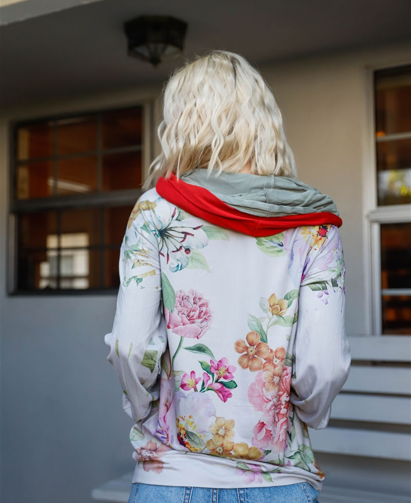 Elevate your everyday look with our Grey Pink Flower Print Contrast Double Hood Sweater, proudly made in the U.S.A. This comfortable and stylish sweater, available in sizes S, M, and L, effortlessly combines fashion and comfort.