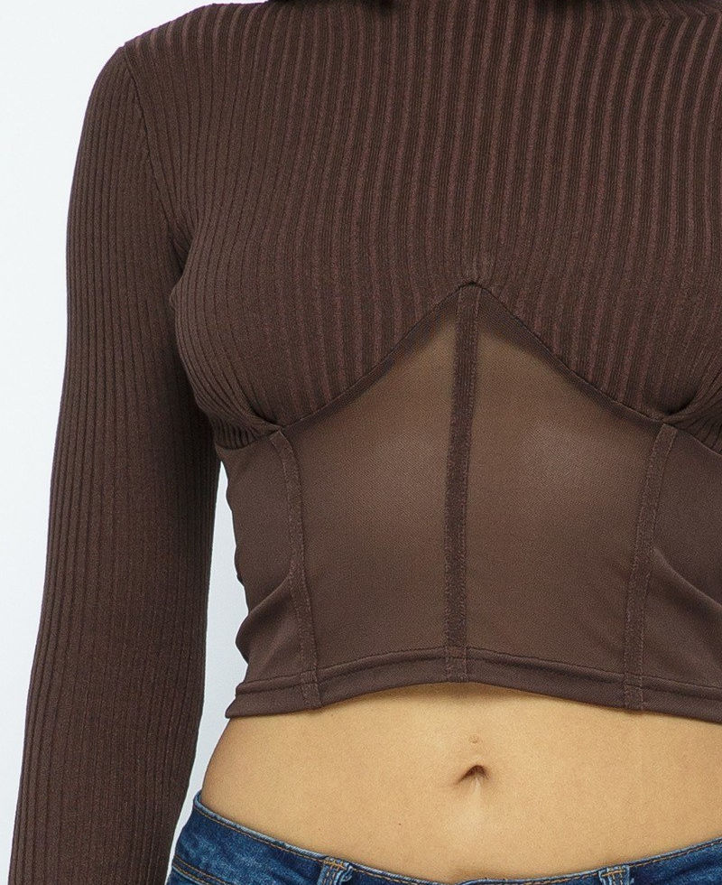 Elevate your wardrobe with our Knit Crop Top with Bottom Mesh in rich Chocolate. Add it to your cart now for a trendy and sophisticated addition to your fashion collection!