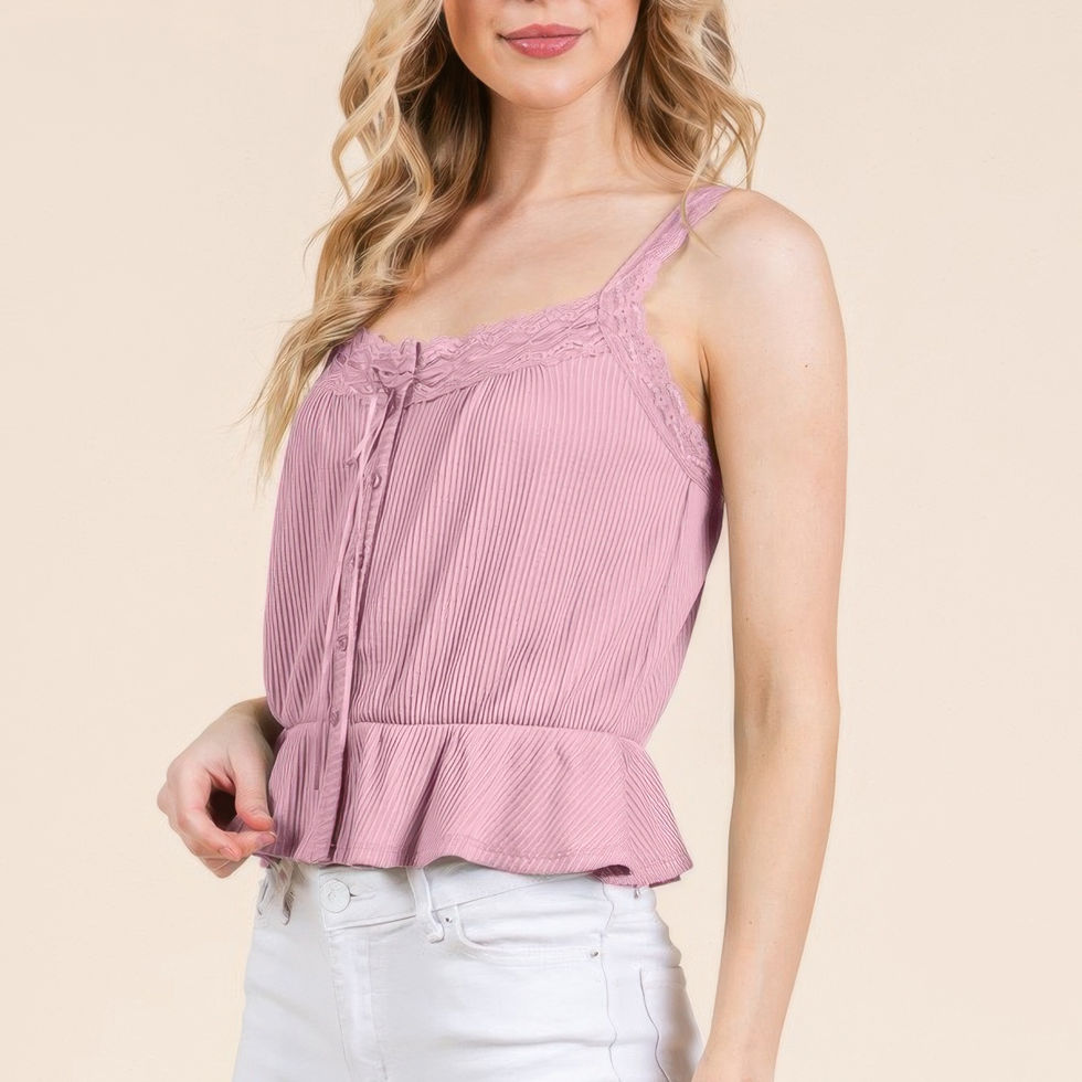 Add a touch of elegance and charm to your wardrobe with our Lace Peplum Tie Front Ribbed Cami Top in Pink Mousse. Order now and experience the perfect blend of style, comfort, and versatility!