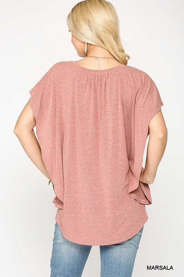 - "Obsessed with this top! The leopard jacquard is so on-trend, and the ruffled sleeves add a playful touch. The Marsala color is perfect for adding a hint of warmth to my wardrobe!" - A. R.
