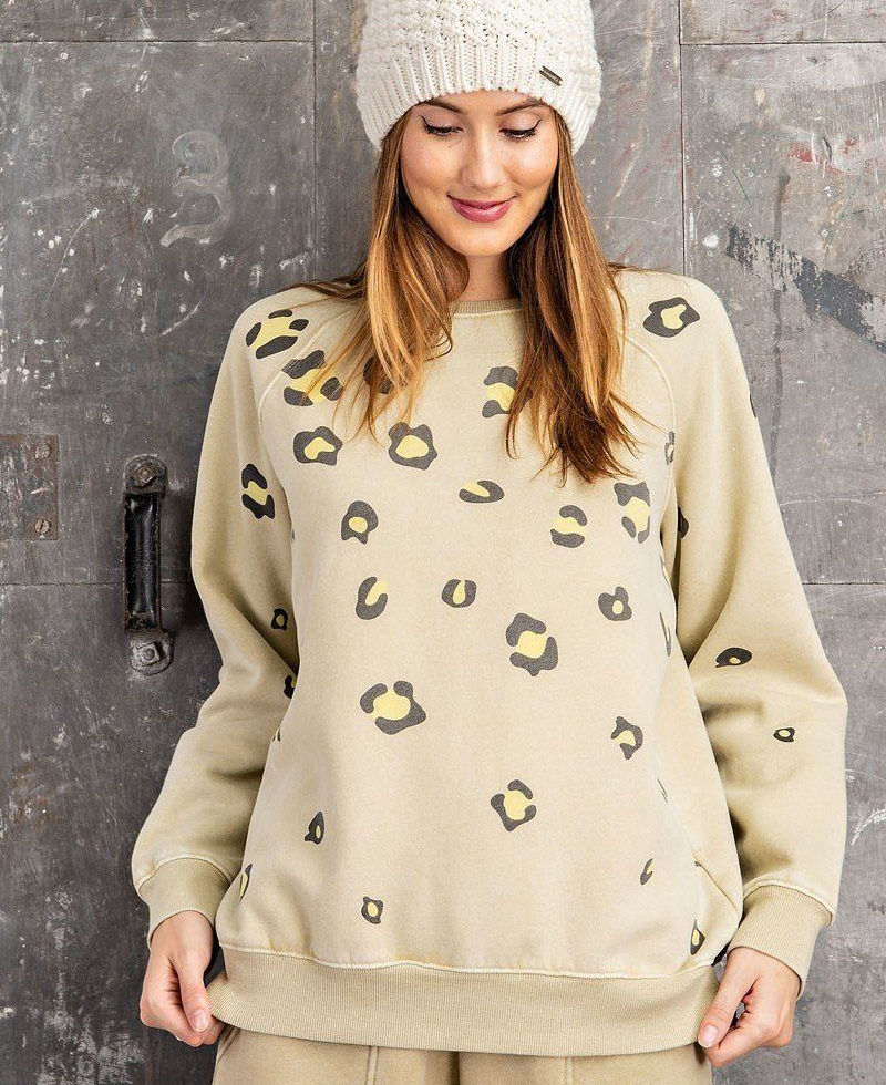 Long Sleeve Leopard Print Washed Terry Sweatshirt