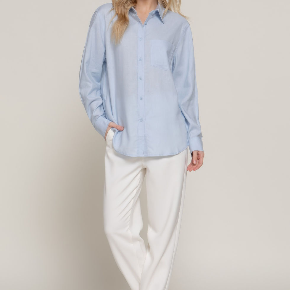 This shirt offers a chic, easy-to-wear style that works for various occasions. The light blue color is calming and versatile, while the linen-blend fabric ensures breathability and comfort throughout the day.