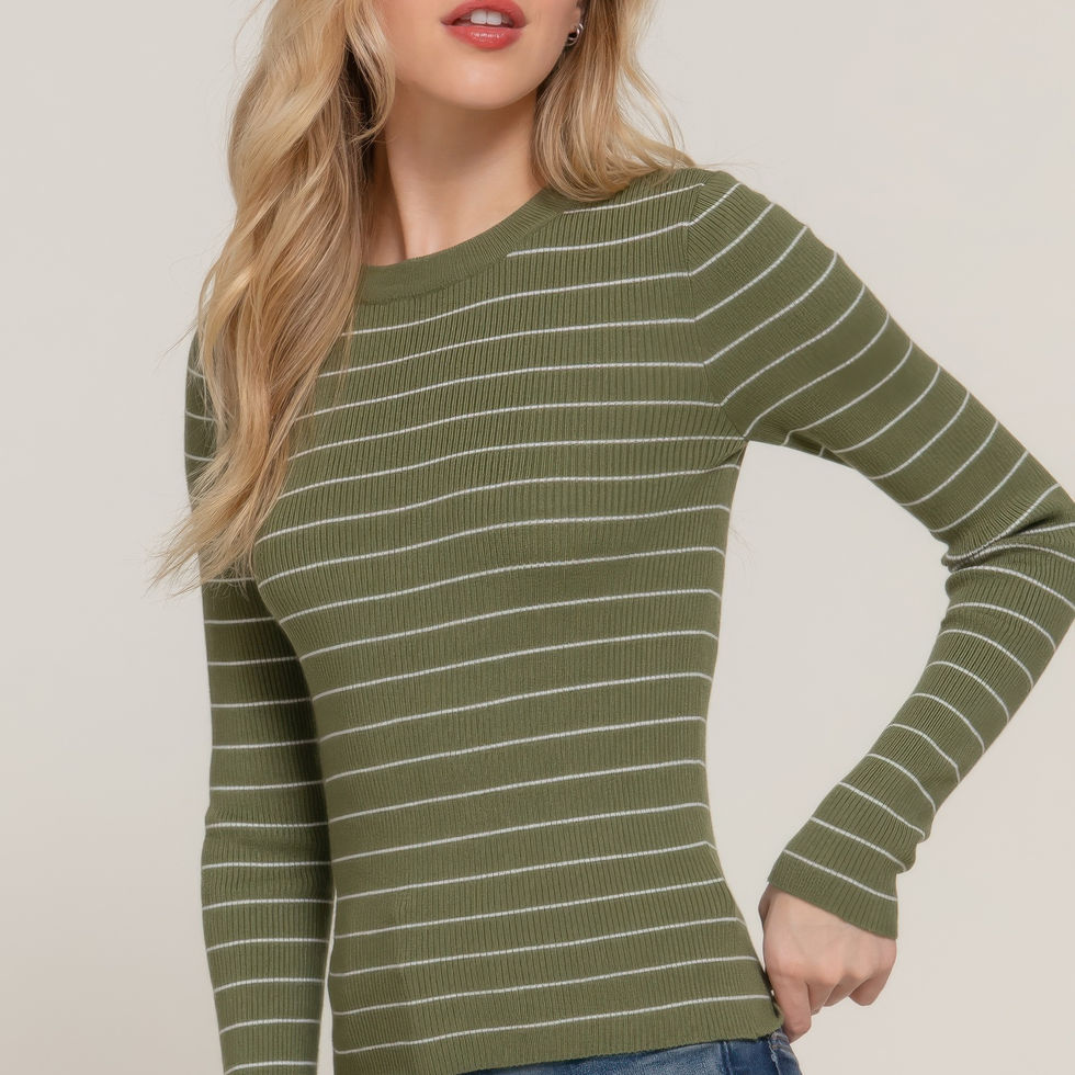 Add the Long Sleeve Crew Neck Stripe Sweater in Olive/White to your cart today and enjoy a cozy, stylish look for any occasion!