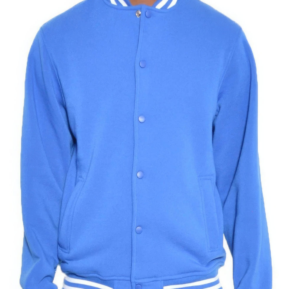 Introducing our Men's Fleece Snap Button Varsity Jacket, meticulously crafted from 100% polyester fleece for optimal warmth and durability.