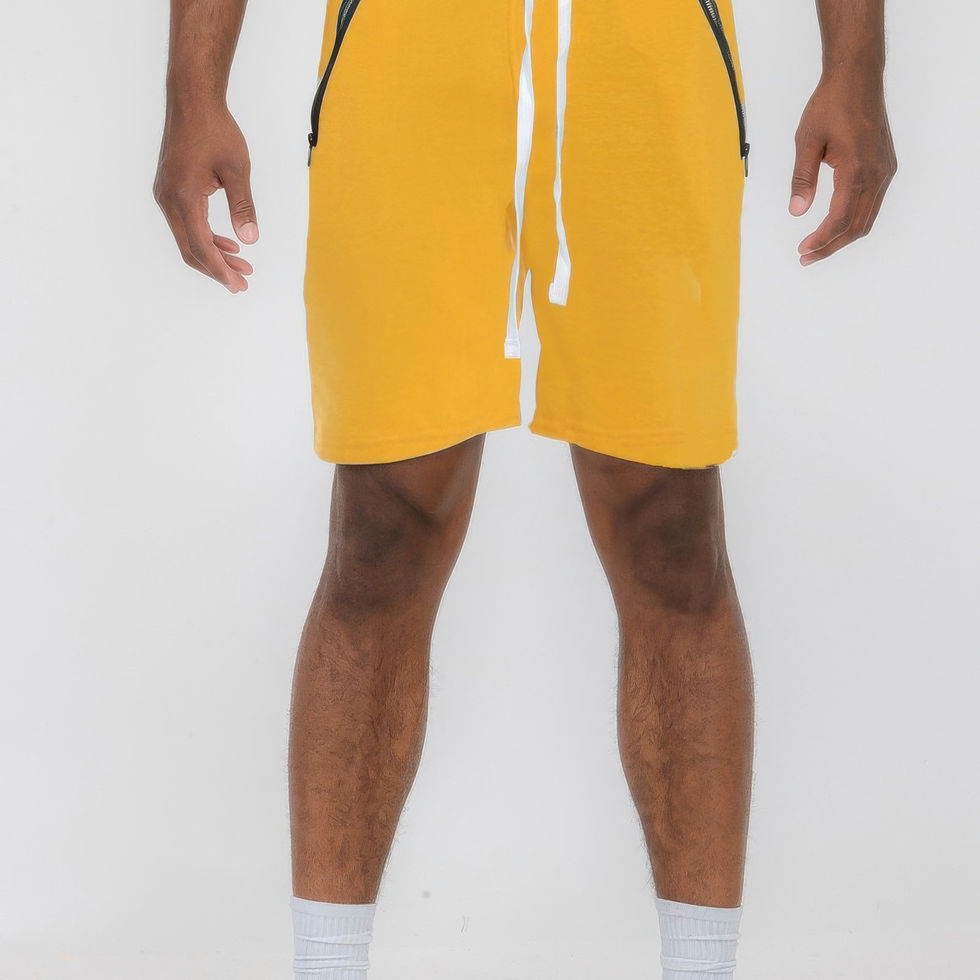 Design: These shorts feature a comfortable elastic waistband with a contrast rib, a drawstring for an adjustable fit, two zippered side pockets for secure storage, and two back pockets for added convenience.