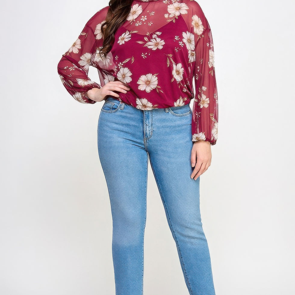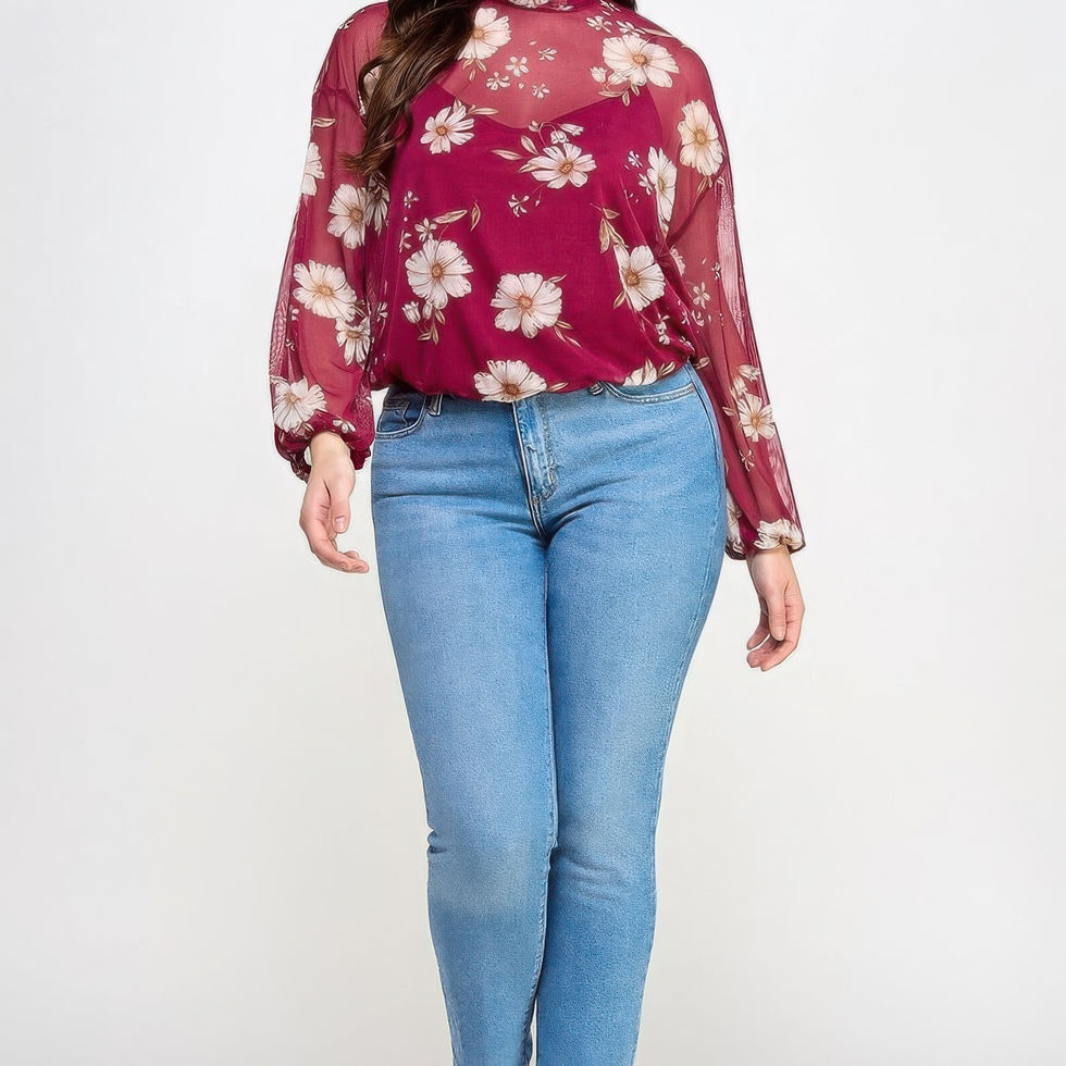 This top offers a unique combination of elegance and comfort with its soft floral mesh design, mock neck, and versatile fit. Whether you're attending a casual gathering or a formal event, this top ensures you’ll stand out with effortless style. The attached cami provides added confidence without compromising on style.