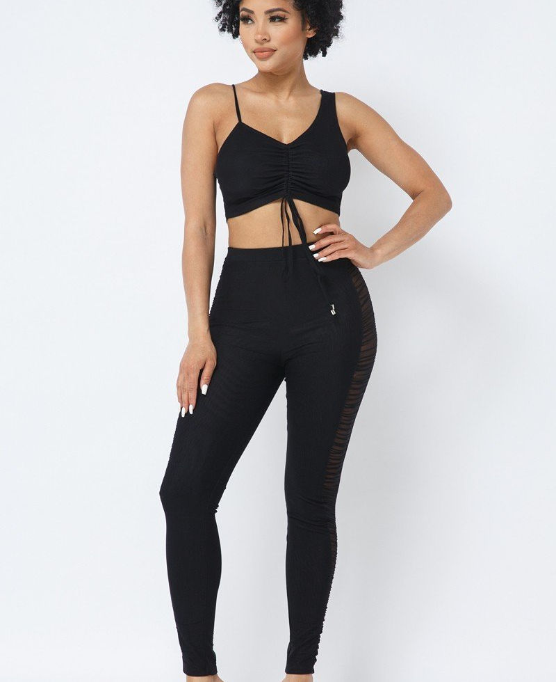 Mesh Strappy Adjustable Ruched Crop Top With Matching See Through Side Panel Leggings
