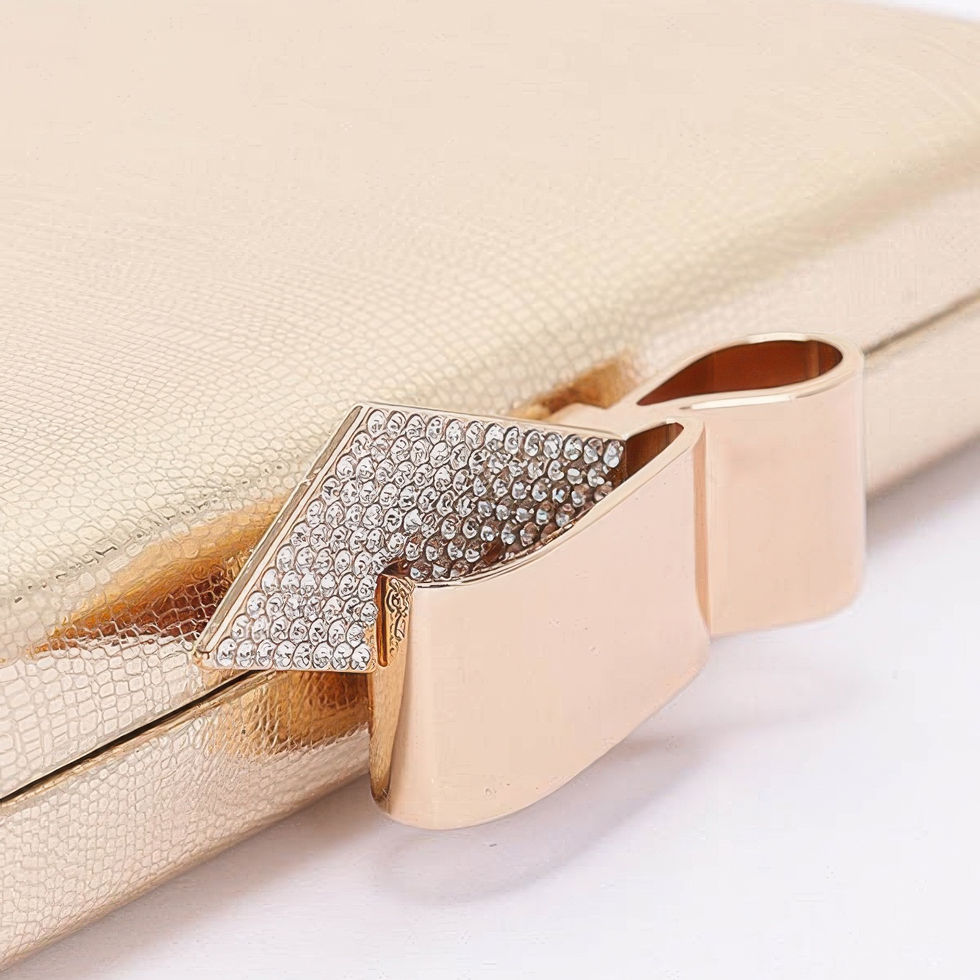 Elevate your evening look with the Elegance Clutch, a stunning accessory that exudes sophistication and charm. Crafted from premium polyurethane with mixed metal accents, this gold clutch features a luxurious metal ribbon top case and a sleek chain detail for added glamour. Its compact design is perfect for carrying your essentials while making a bold style statement. Whether for weddings, parties, or special events, the Elegance Clutch is your go-to piece for timeless refinement.