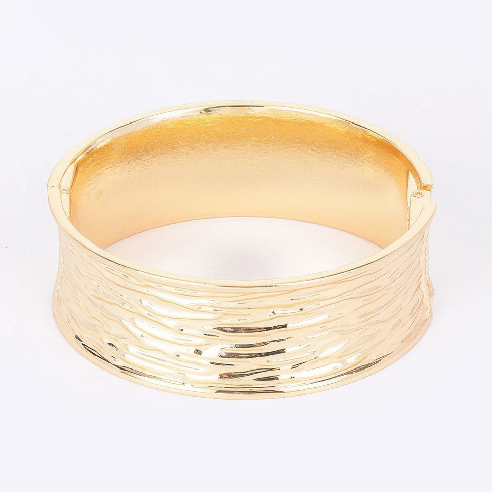 This cuff is a timeless accessory, ideal for anyone looking for a blend of modern design and practicality. The spring hinge mechanism makes it effortless to wear, while the polished metal finish adds a touch of sophistication to any ensemble.