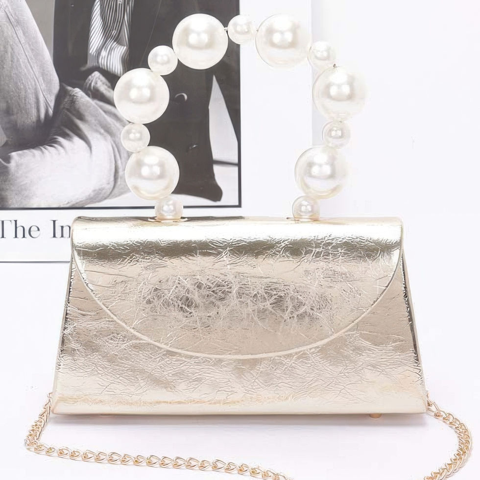 Add a refined touch to your evening ensemble with the Metallic Pearl Handle Flap Bag. Designed with a sleek silhouette and elevated by a lustrous pearl-accented handle, this clutch is the epitome of understated glamour. The metallic finish adds just the right amount of shine, while the structured form keeps your essentials secure and stylishly stored. Whether you're attending a formal event or a chic dinner, this piece brings elegance and charm to every occasion. Crafted with quality materials, it’s a timeless addition to your accessory collection.