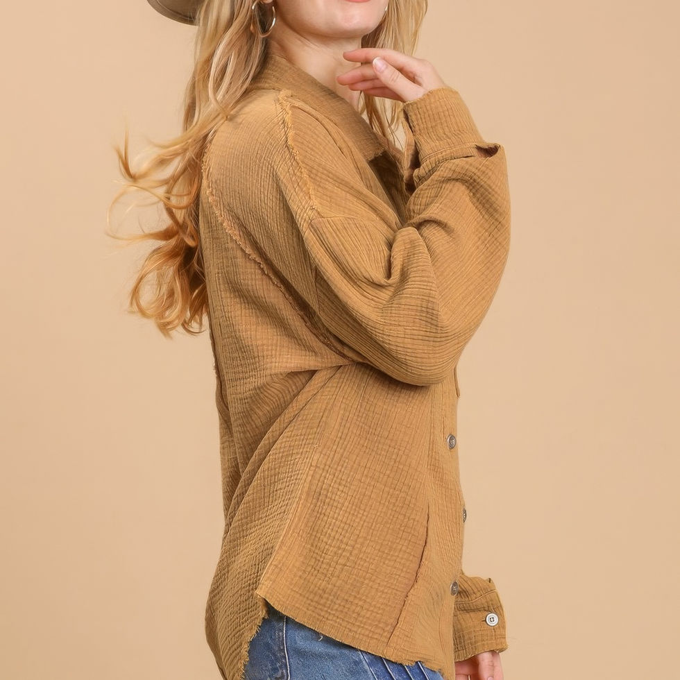 Add the Mineral Wash Button Down Top with High Low Hem in camel to your cart now and embrace the perfect blend of comfort, style, and modern chic!