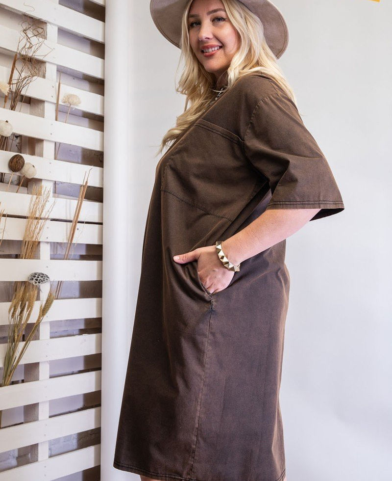 Introducing our Mineral Washed Loose Fit Dress, an effortlessly chic addition to your wardrobe. Crafted with attention to detail, this knee-length dress seamlessly combines a relaxed silhouette with chest and side pockets for a laid-back and stylish look.