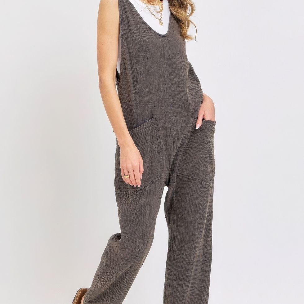 Enhance your summer wardrobe with our Mineral Washed Summer Jumpsuit. Add it to your cart now and enjoy the perfect blend of fashion and comfort!