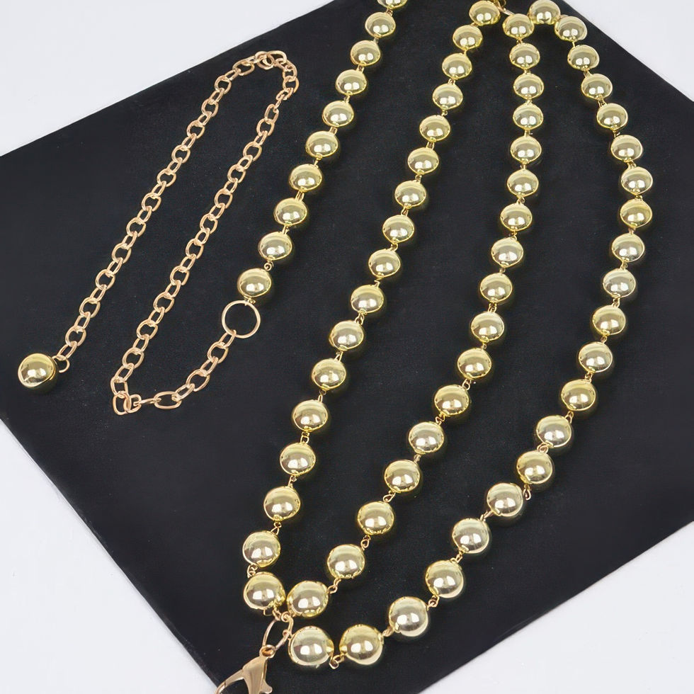 Sleek and eye-catching, the Multi Layered CCB Ball Chain Belt brings a bold accent to your wardrobe. Featuring layered strands of gleaming CCB ball chains, this belt delivers modern texture and statement-worthy shine. Its lightweight construction and adjustable fit make it as practical as it is stylish. Designed to elevate dresses, oversized shirts, or tailored pieces, it adds an edgy yet polished touch to any ensemble. A must-have for those looking to accessorize with confidence and flair.
