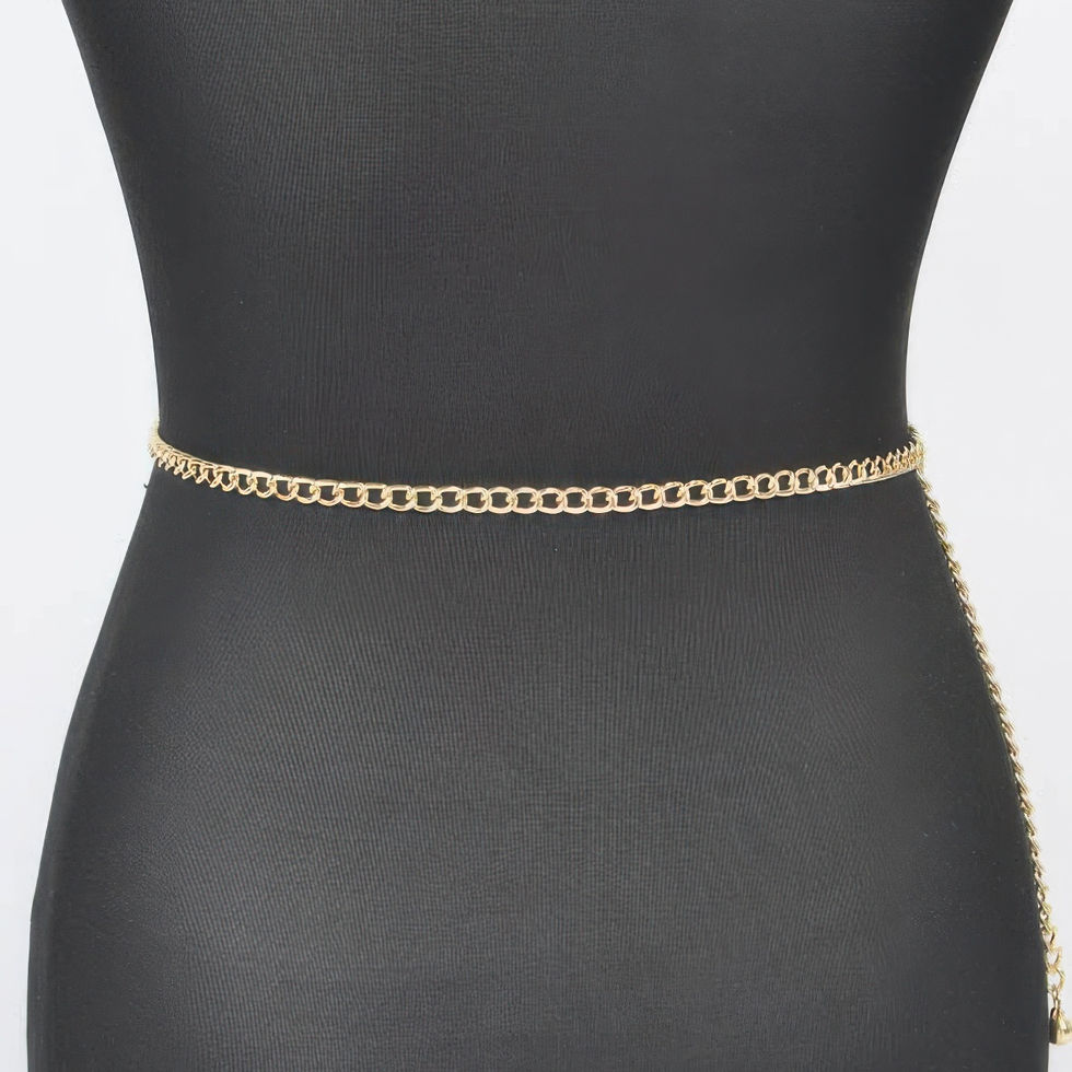 Refined and eye-catching, the Multi Layered Chain Belt is a statement accessory that blends elegance with modern flair. Designed with delicate chains and lustrous faux pearls, this belt adds a sophisticated accent to any ensemble. Whether styled over a dress, skirt, or blazer, the layered look creates dimension and visual appeal. Crafted from durable iron and measuring 46" in length with a slim 0.5" width, it offers versatility and a flattering fit. This belt is the perfect finishing touch to elevate your outfit with grace and style.