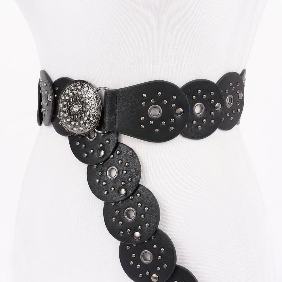 Add the Multi Metal Round PU Vintage Belt to your collection today and make a bold statement with this chic and versatile accessory!